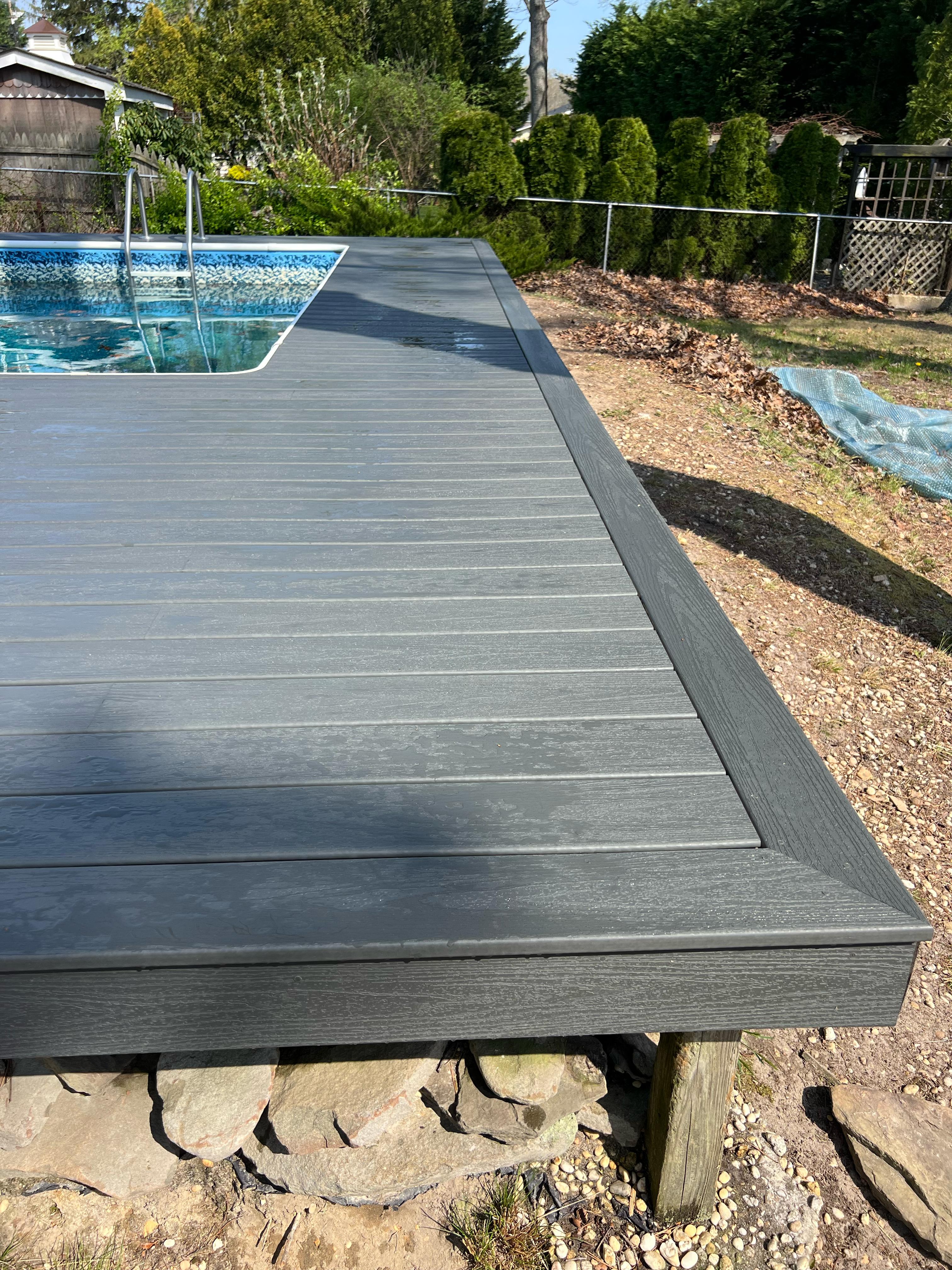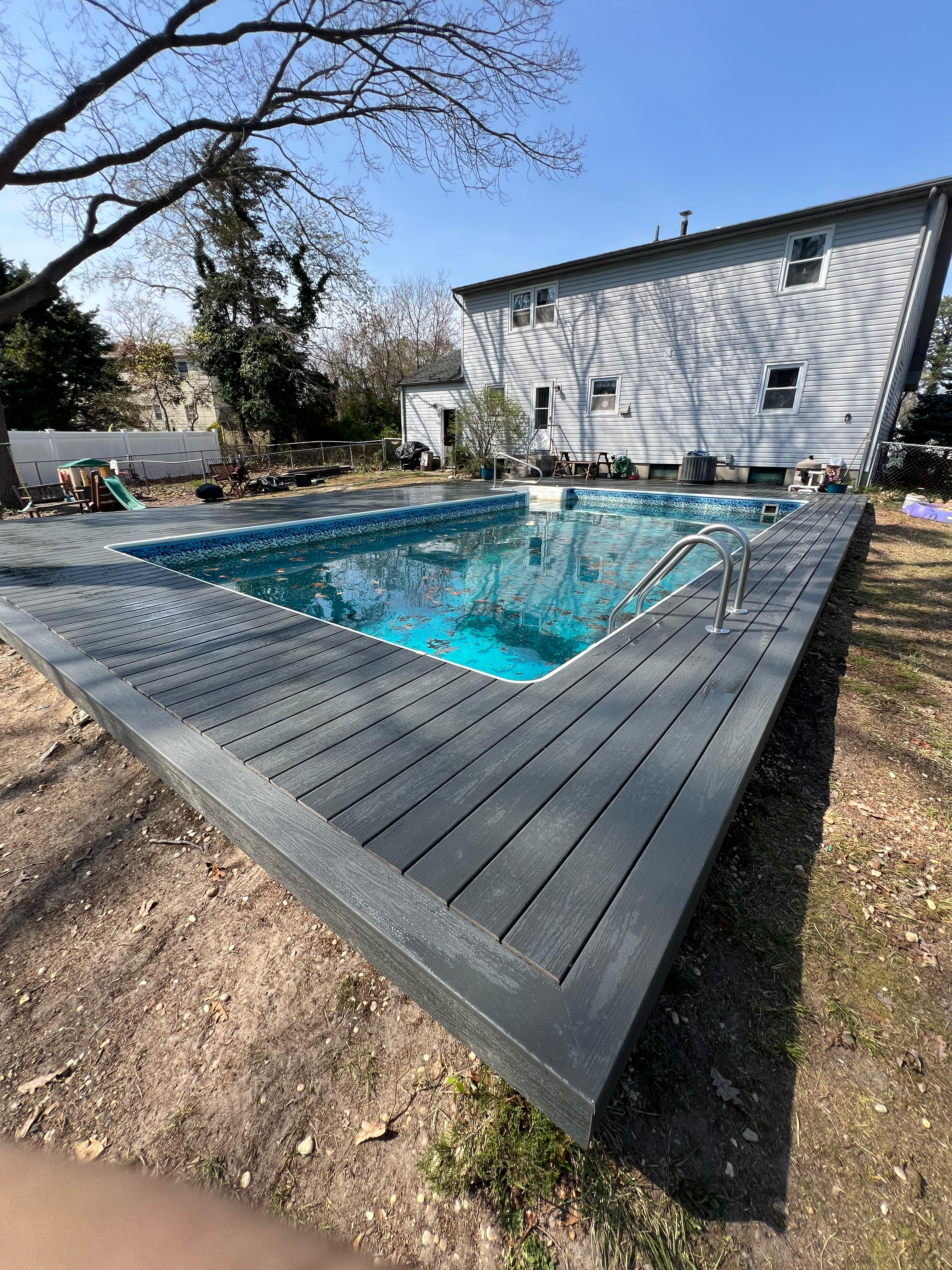 This project features the full reconstruction of a residential pool deck designed to combine durability, aesthetics, and precision craftsmanship. The homeowner requested a modern, low-maintenance alternative to natural wood that would complement the pool’s blue liner and the home’s neutral exterior. Sweet Home Construction delivered a custom gray composite deck that integrates seamlessly with the property’s layout and enhances backyard usability.