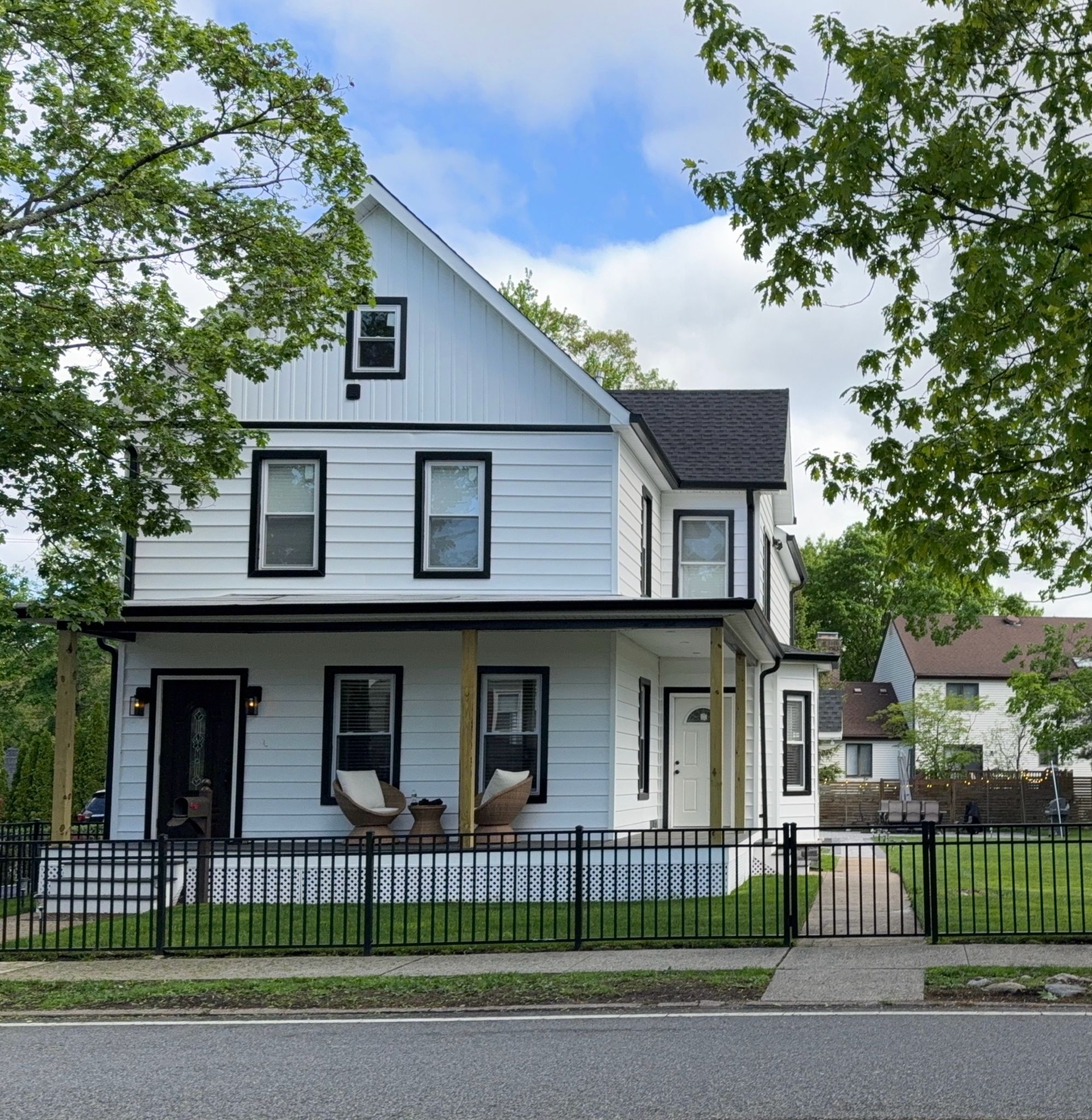 The original siding was a mix of light blue and beige tones, which was updated to a modern white finish with black trim.