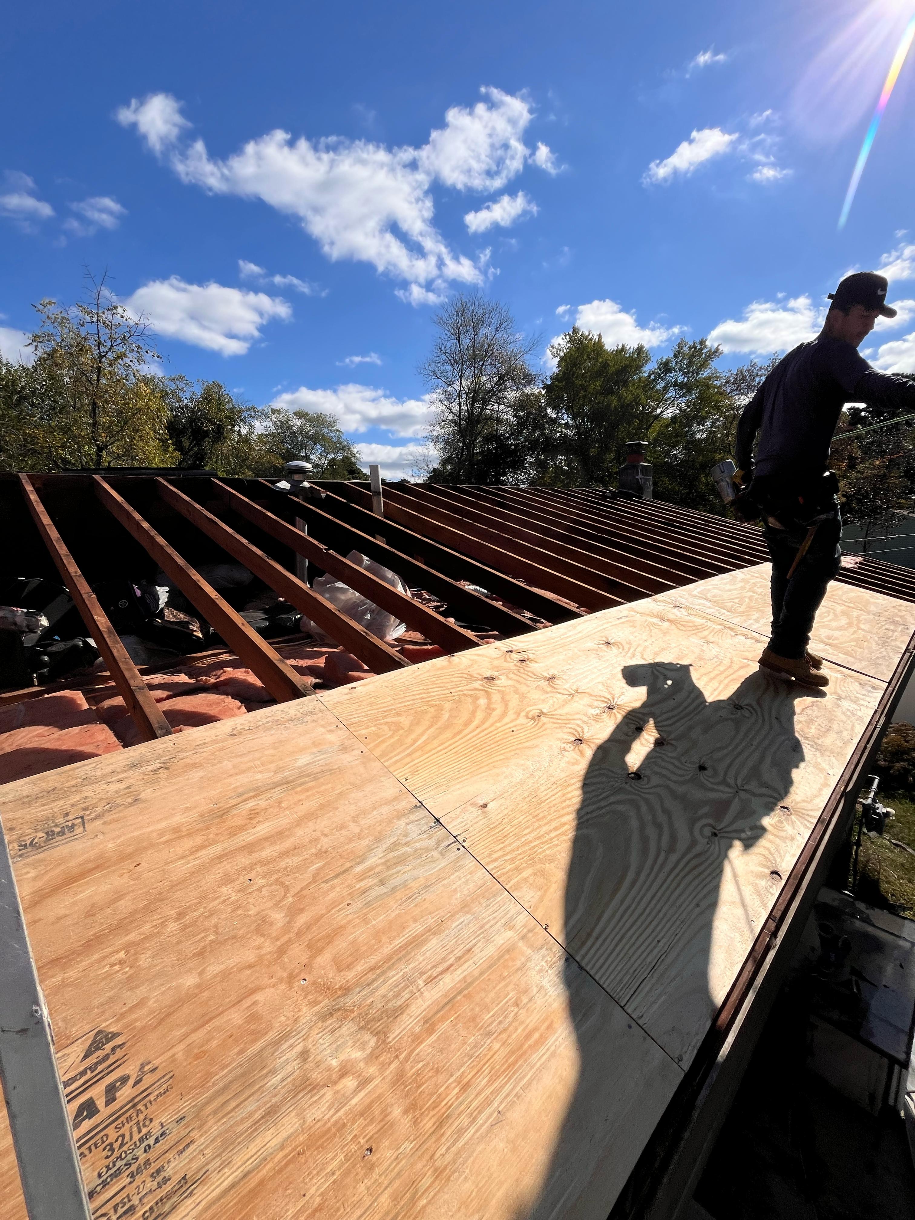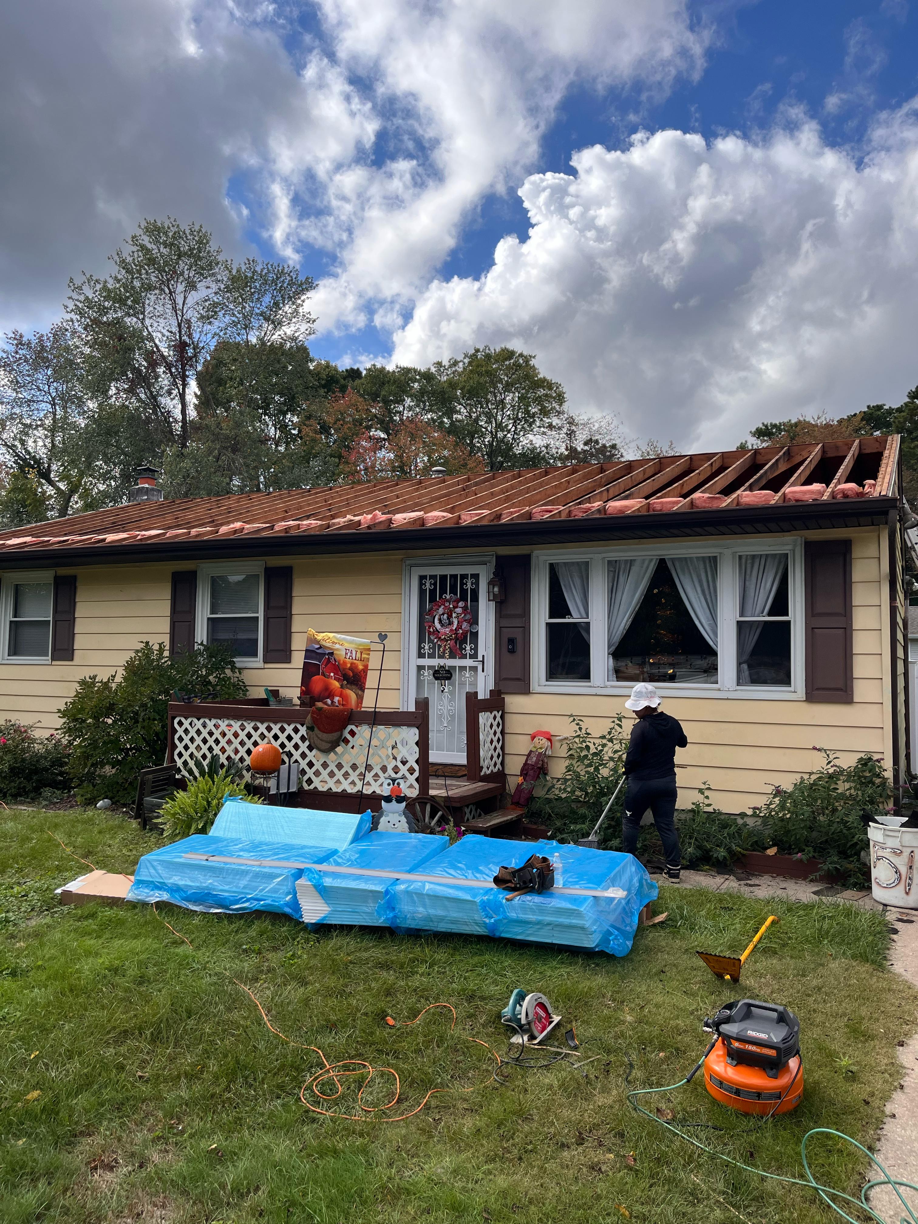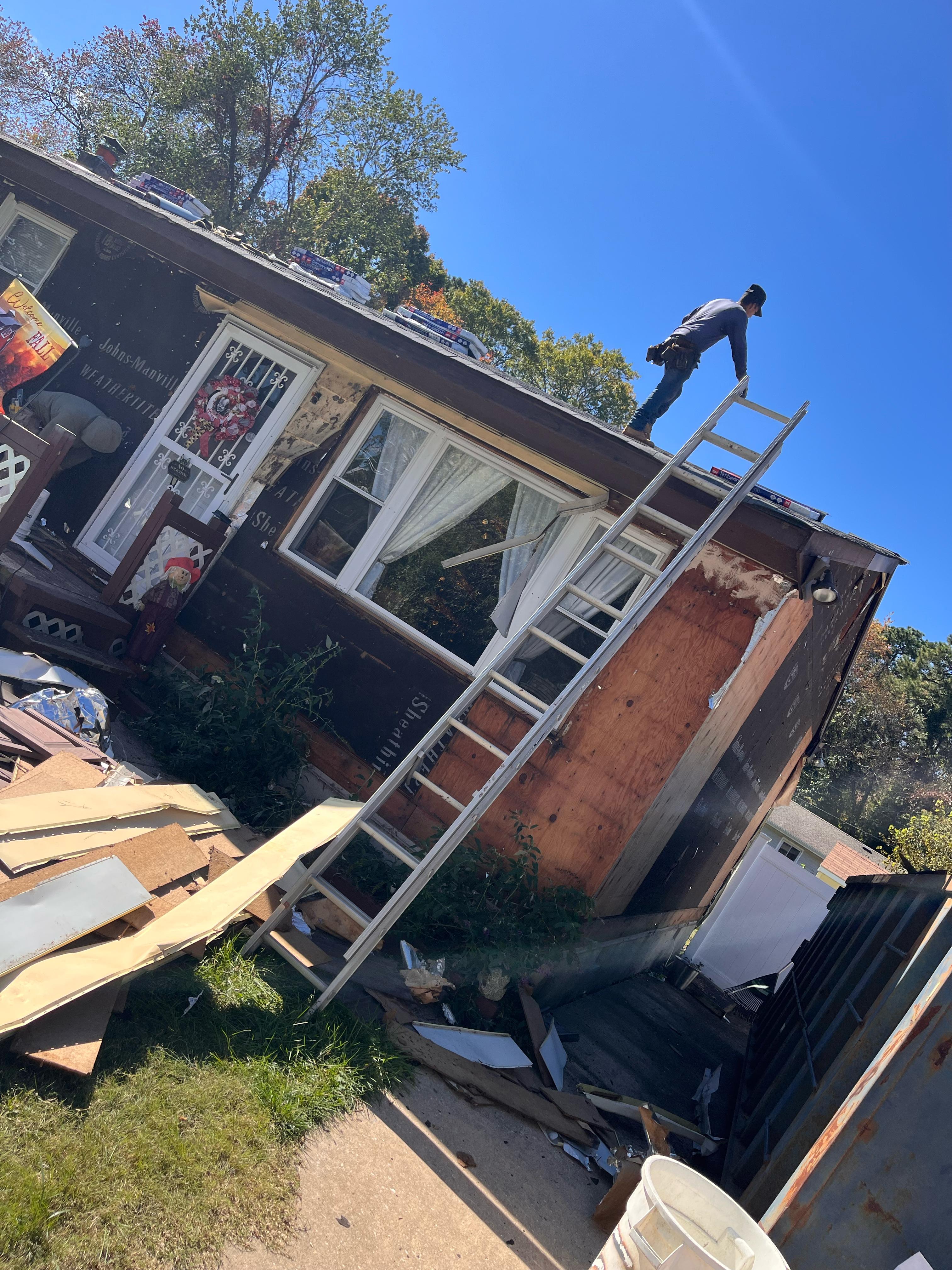 Removal of old roofing materials Installation of new plywood sheathing Application of new roofing materials Removal of old siding Installation of new siding