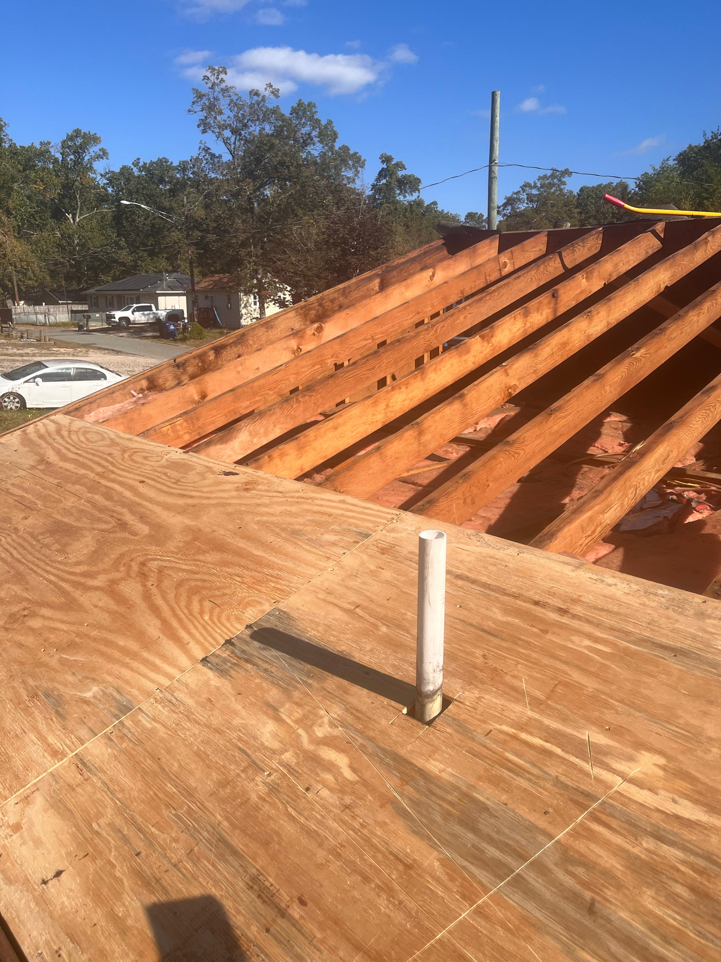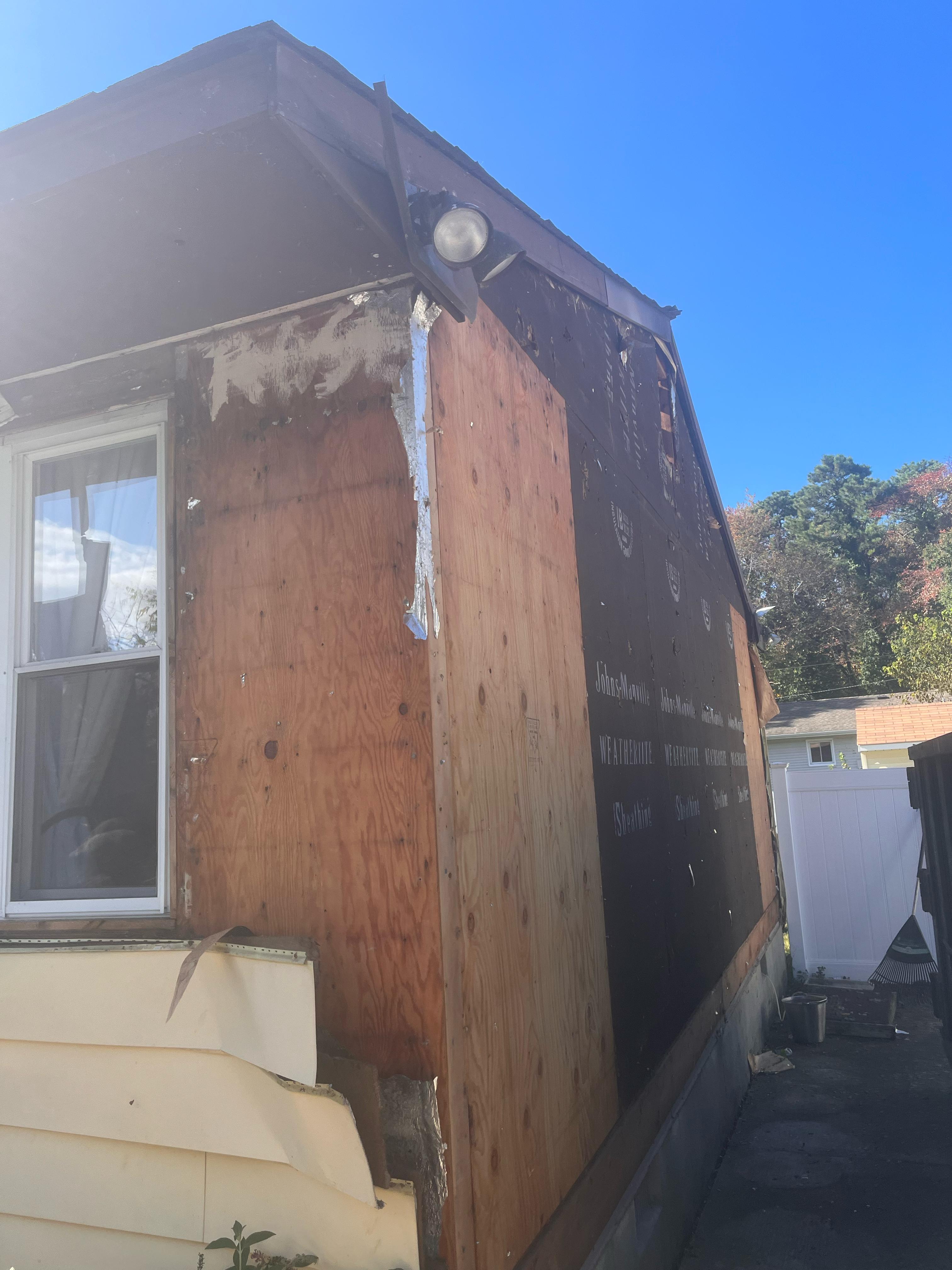 The existing roof and siding were removed and replaced with new materials. The roof structure was reinforced with new plywood sheathing.